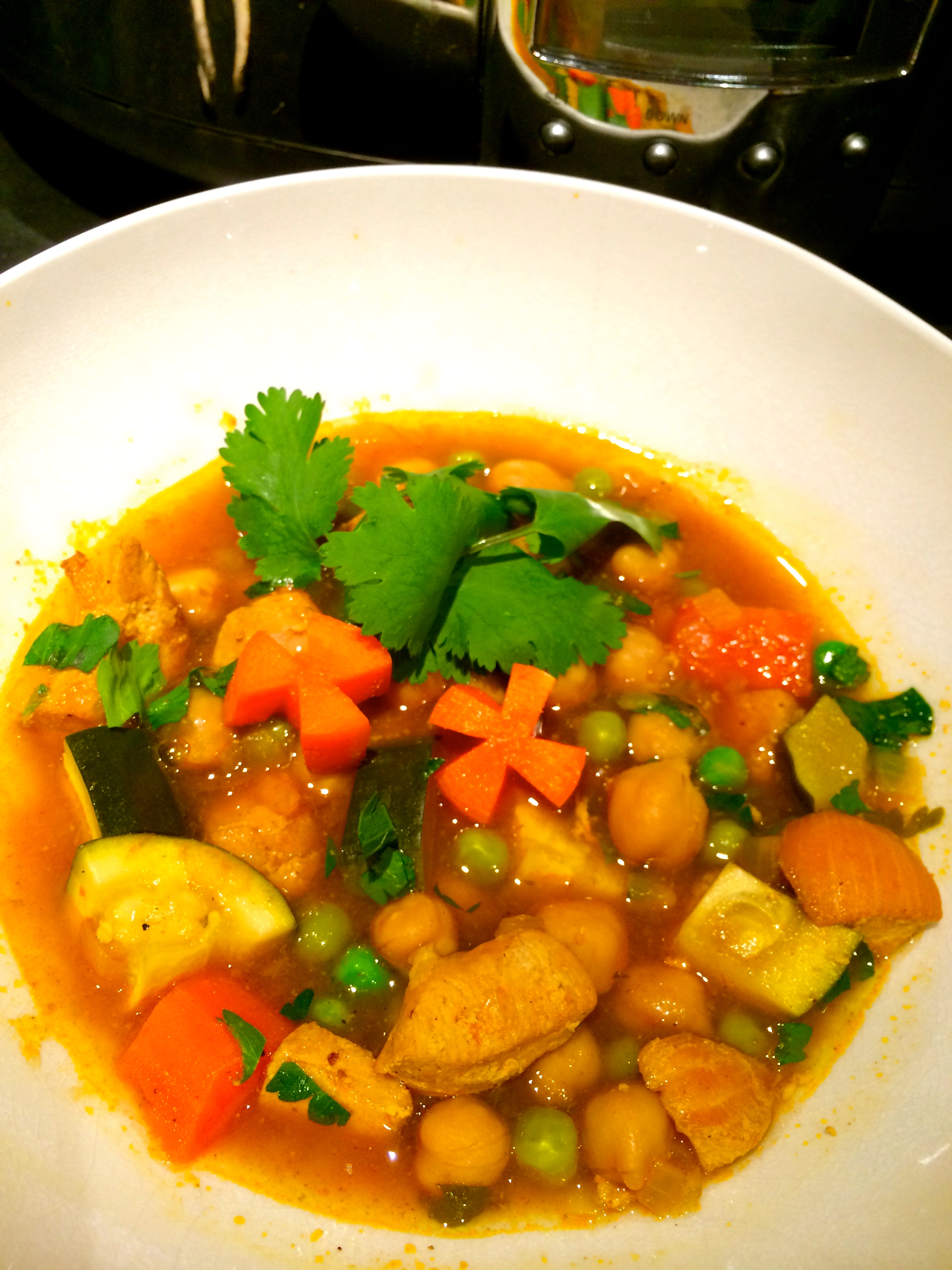 Just imagine coming home on a cold day to the aroma of curry wafting about the house from this Indian inspired soup. It makes me want to take a deep breath, let it go and say, ” Ahhhhh….” The flavors are warm without being spicy; just enough to take your mind off the biting wind. Add some bread with a crunchy crust like a baguette or a sour dough and this would be a complete meal, but I prefer to enjoy this by itself. Originally, this recipe was vegetarian and had a shortcut: (omit the chicken) microwave all the ingredients through the garlic and then add everything to the slow cooker. In the essence of time you could do this, however, I feel it is important to bring out the aromatics in the curry and blossom the flavors in the onion and garlic in a pan prior, otherwise you would miss out on that flavor profile in the final outcome.