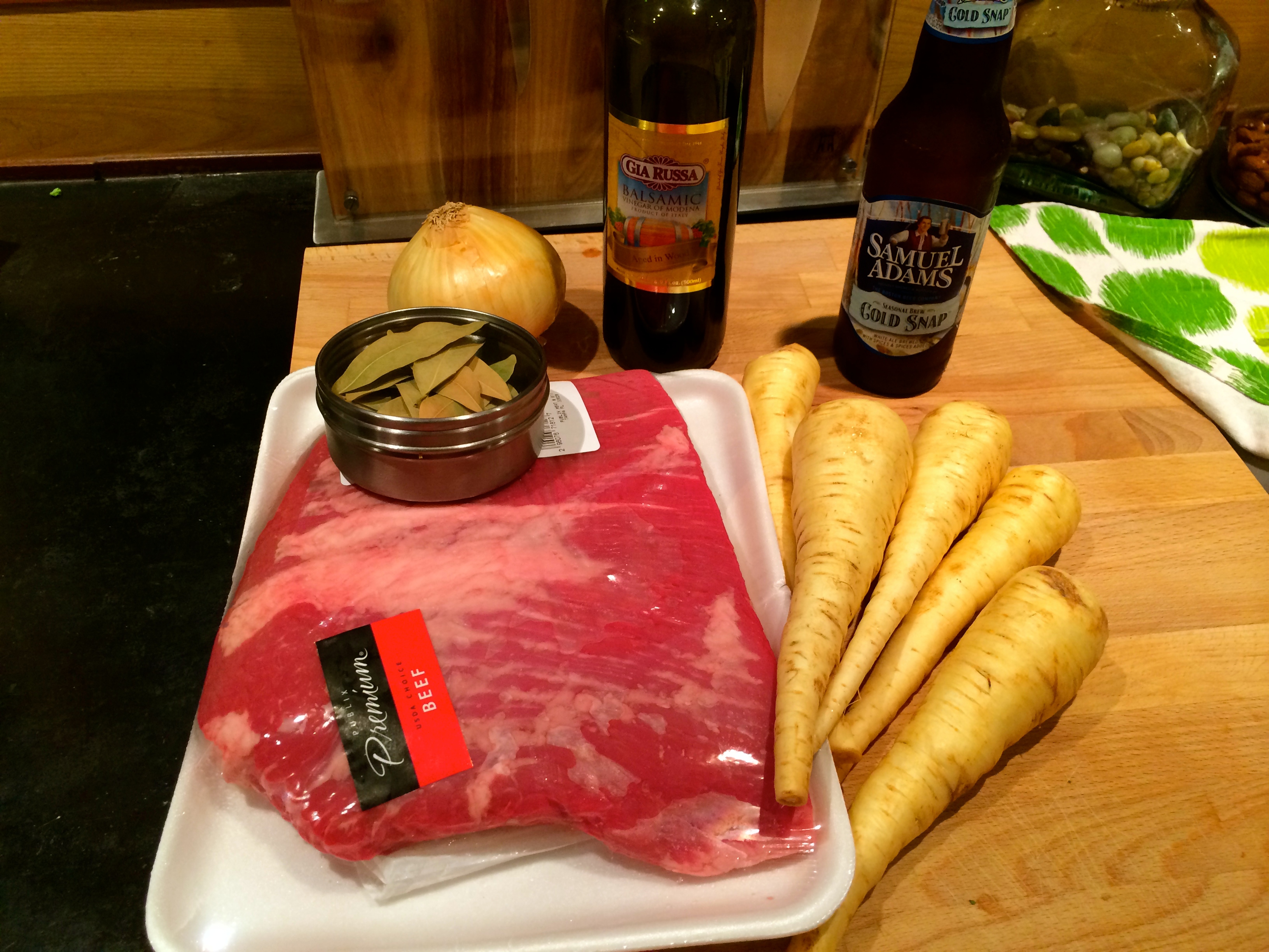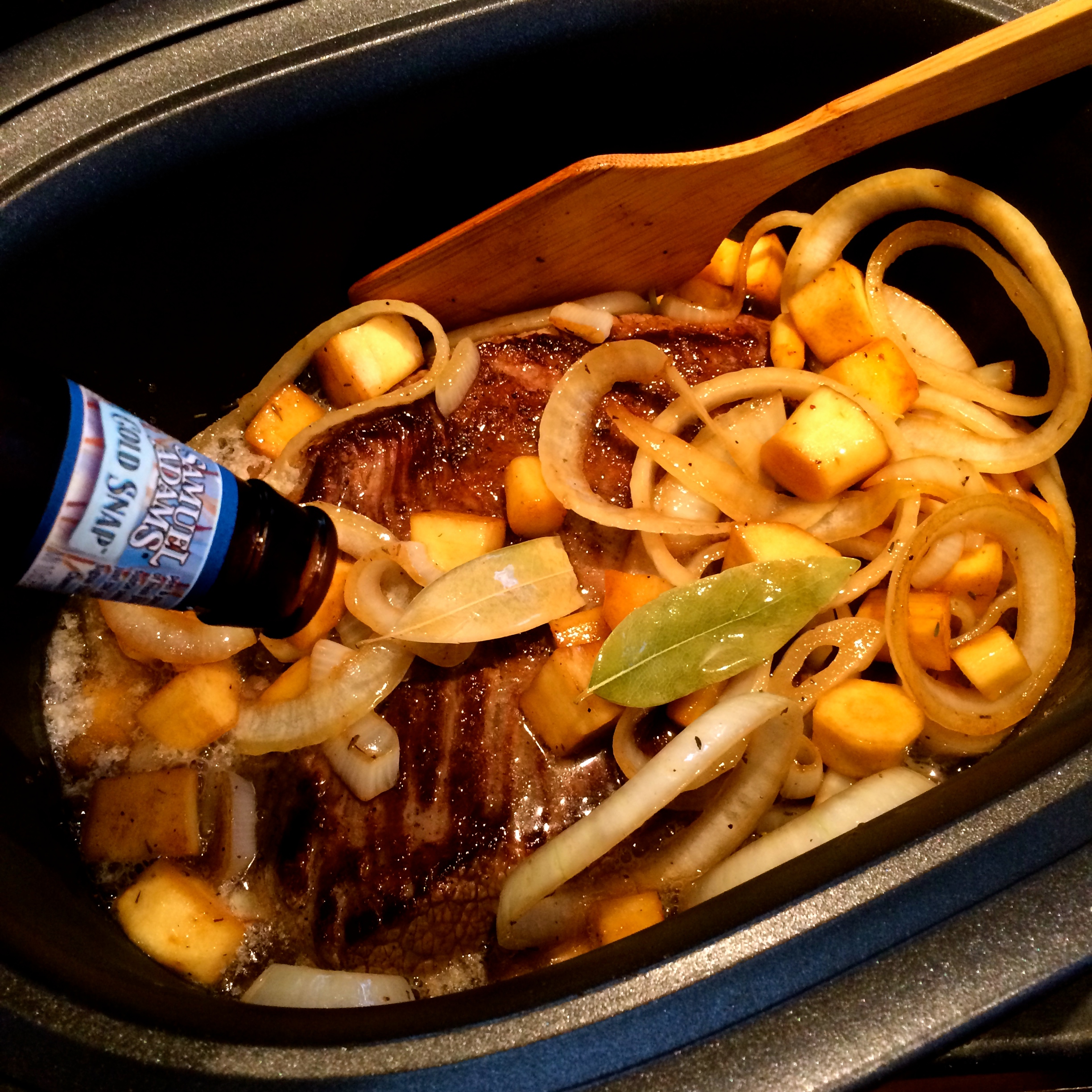 - Place onion mixture, vinegar, bay leaf, and beer in a large electric slow cooker. Place brisket on top of onion mixture. Cover and cook on low for 8 hours. Discard bay leaf. Remove brisket and using two forks, shred the meat. Return shredded meat to slow cooker and stir once or twice. Serve with sauce and some crusty bread.