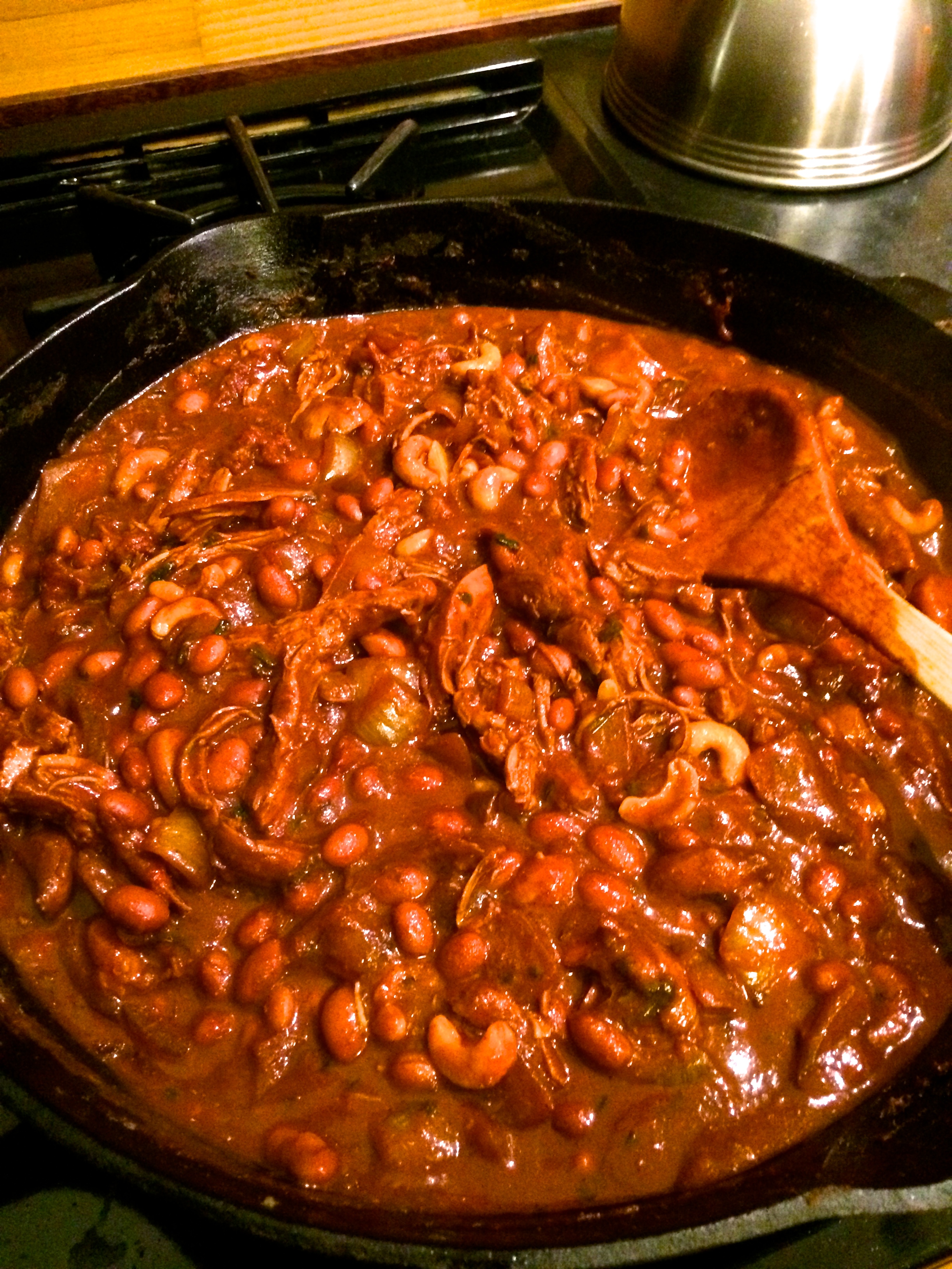 Remove pan from heat and transfer chicken to a bowl. With 2 forks shred meat, discard bones and skin. Return chicken to pan and stir in cashews, remaining tablespoon coriander, chocolate, and beans. Cook chili over moderate heat, stirring, until heated through and chocolate is melted. Chili may be made 2 days ahead and cooled completely, uncovered, before being chilled, covered.