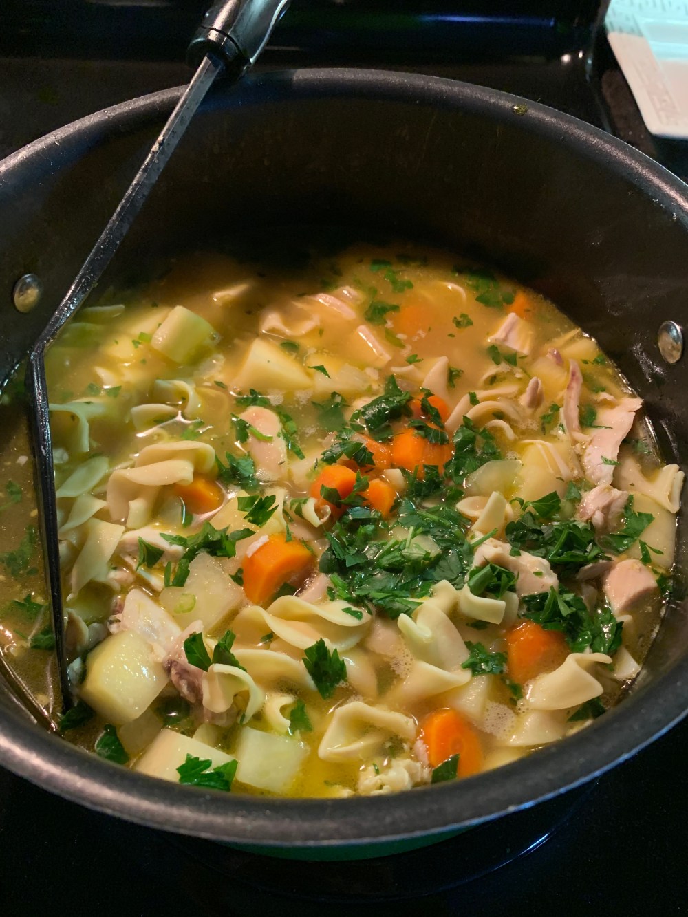 - Add noodles and chicken, and bring to boil. Cover, reduce heat, and simmer 10 minutes. Stir in parsley.