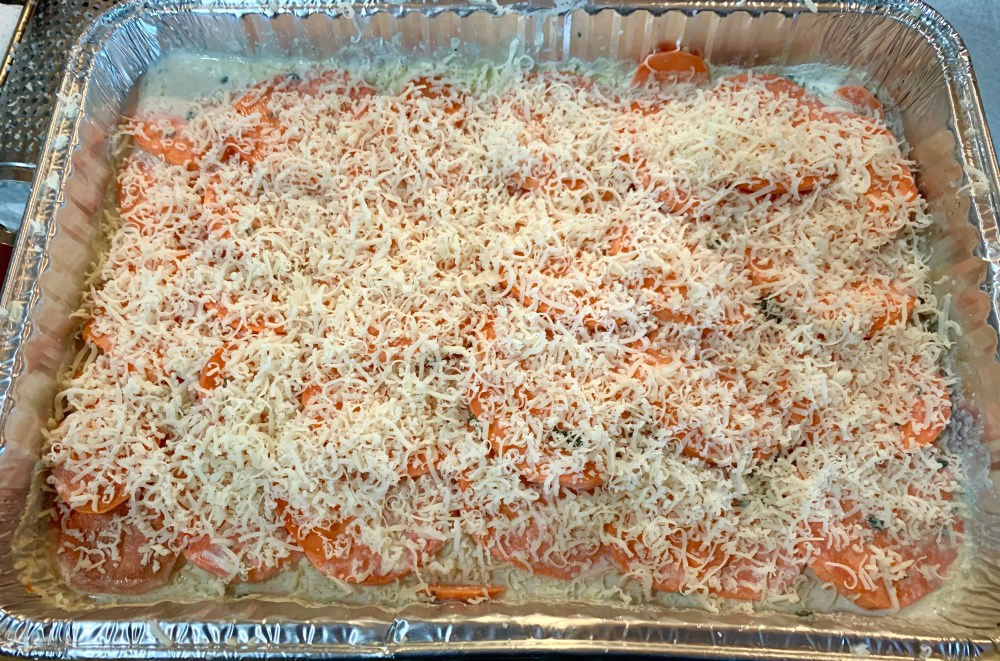 - In a casserole or pie dish, start the first layer by placing the potato slices in alternating, slightly overlapping rows of Russet and Yukon gold potatoes. Stir the warmed cream and add a bit to the top. Sprinkle with Parmesan cheese. Repeat the process (roughly 3 – 4 layers) ending with generous layer of cheese on top.
